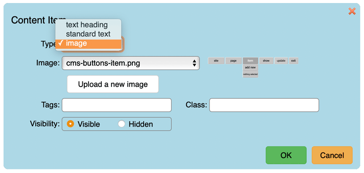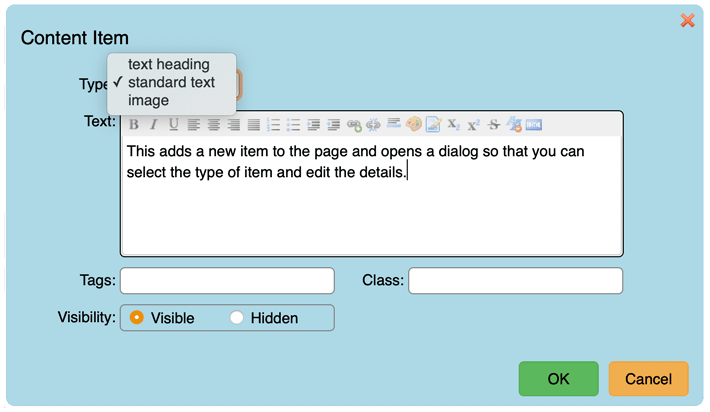 This adds a new item to the page and opens a dialog so that you can select the type of item and edit the details. Here a text item is being added: